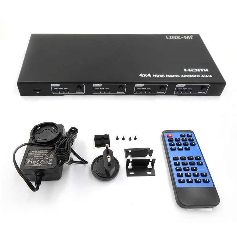 LINK-MI LM-MX14 is a 4x4 HDMI Matrix Switch which support 4K@60Hz YUV4:4:4, 18Gbps, HDCP2.2. It comes with many functions like EDID management, downscaler, firmware upgrade...etc.