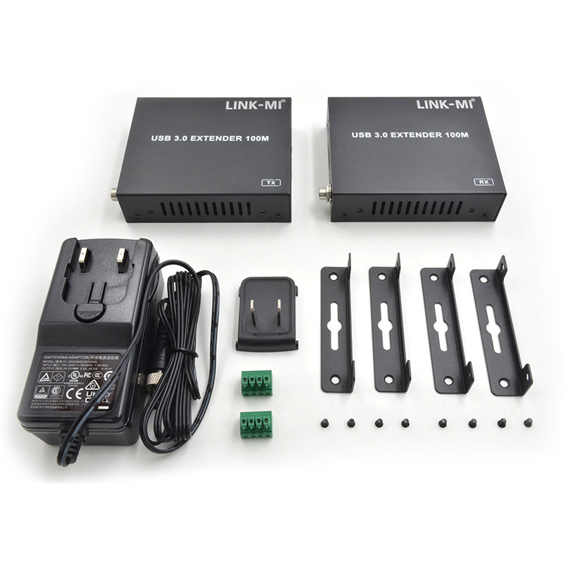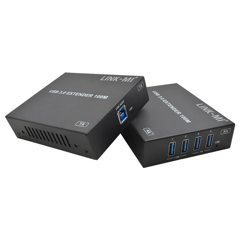 LINK-MI LM-EX100U USB 3.0 Extender can extend USB signal to a distance up to 100m/328ft via a single CAT6a cable. Transmitter features with one USB 3.0 Type B input, one FSYSNC GPIO input and one RS-232 pass-through. Receiver features with four USB 3.0 Type A outputs, one FSYSNC GPIO output and one RS-232 pass-through. Bi-directional 24V PoC is also supported. The product can be widely used for long distance signal transmission between a PC and USB devices.